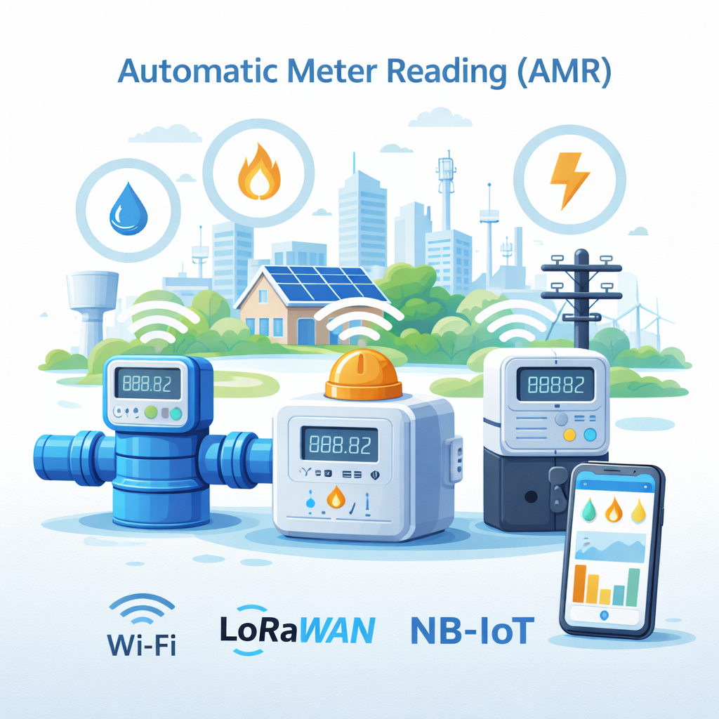Automatic Meter Reading (AMR) enables seamless and accurate data collection across water, electricity, and gas meters by leveraging IoT technology and flexible communication options, including wireless networks such as LoRa, NB-IoT, and Wi-Fi, as well as wired connectivity, to deliver reliable, real-time insights that improve operational efficiency, reduce manual intervention, and support smarter utility management.